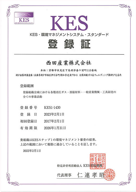 KESとは、京都議定書の発祥地、京都から発信された「環境マネジメントシステム」の規格です。西田産業株式会社は、地球環境の保全が人類共通の最重要課題の一つであることを認識し、全組織を挙げて環境負荷の低減及び環境保護に努力します。